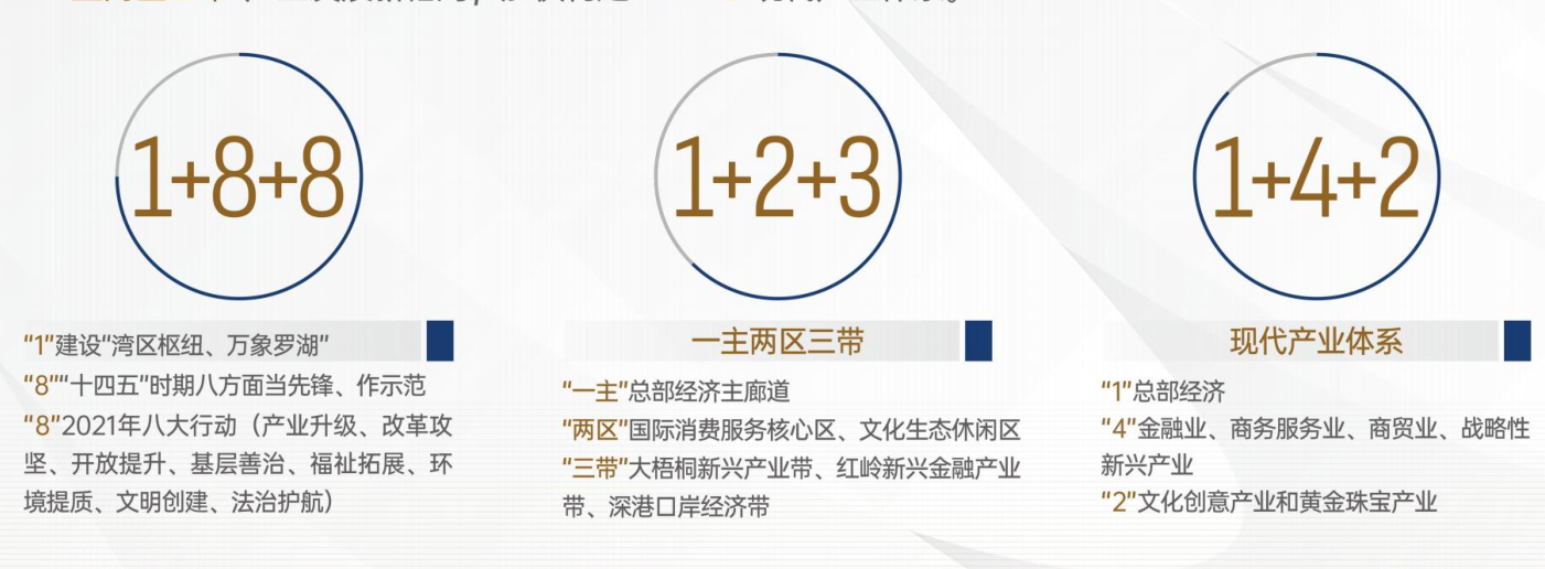 2021年“十四五”开局之际,罗湖提出了“湾区枢纽,万象罗湖”新战略定位。罗湖大手笔推出“1+8+8”施工图,增创竞争新优势,围绕“一主两区三带”产业发展新格局,加快构建“1+4+2”现代产业体系。